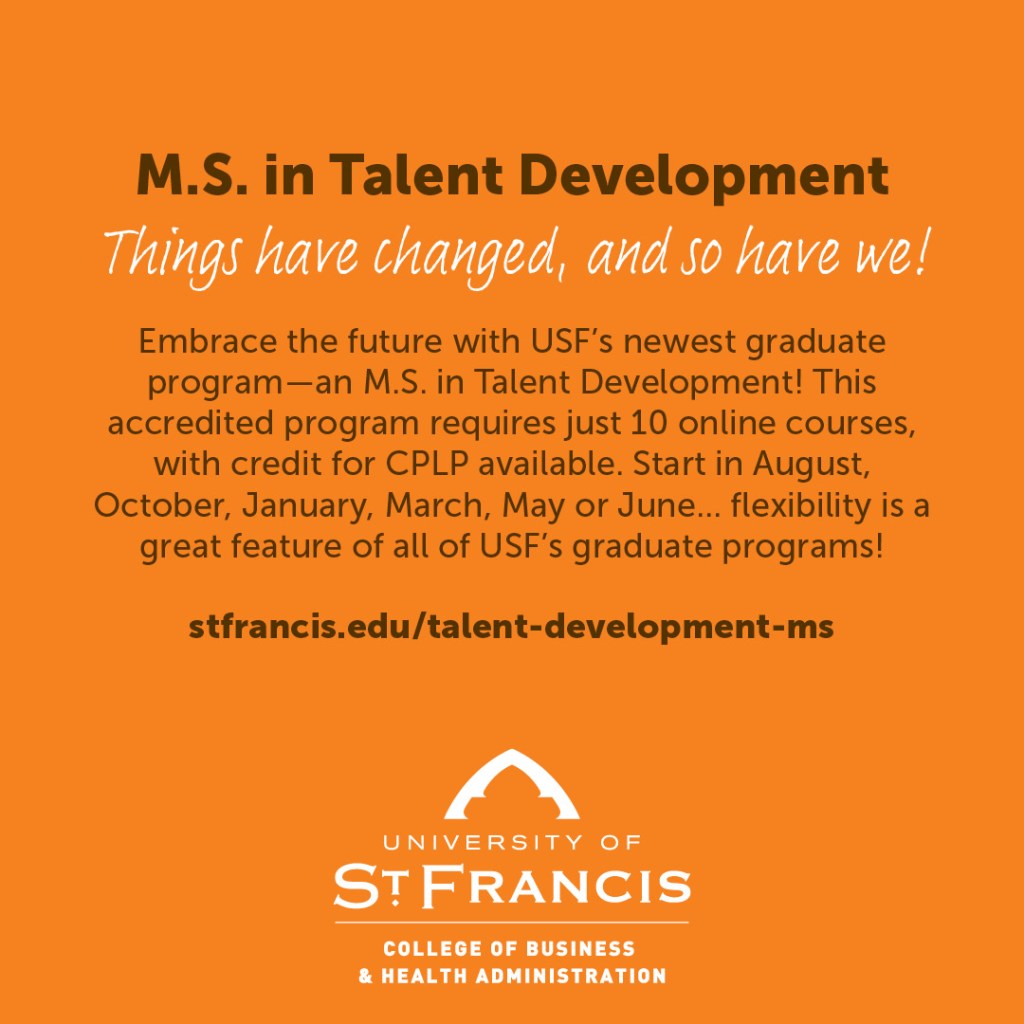 Embrace the future with a M.S. in Talent Development from University of St. Francis, Joliet, Illinois. The new curriculum aligns with the Association for Talent Development (ATD) Talent Development Capability Model™. If you have earned the distinguished Certified Professional in Talent Development (CPTD®) or Certified Professional in Learning and Performance (CPLP®), then you only need nine courses to earn the degree because you can earn credit for prior learning. #ATDmember